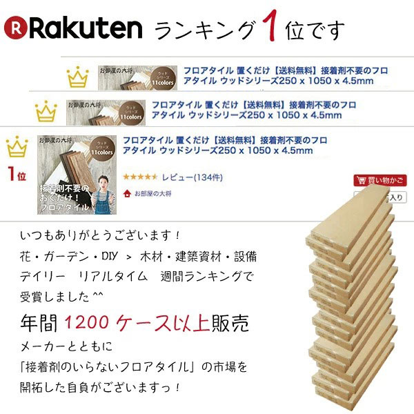 左)ウッド807 右)ウッド803 ウッド807 左)ウッド810 右)ウッド808 ウッド801 ウッド802 ウッド810 ウッド806 ウッド807 ウッド807 接着剤不要のフロアタイルの評価、ランキング受賞 お陰さまでご好評頂き、楽天床材ランキングで1位を獲得しました。